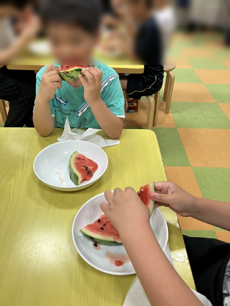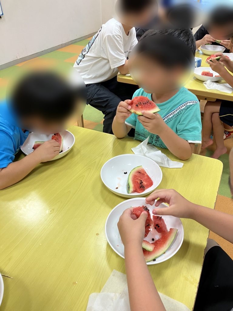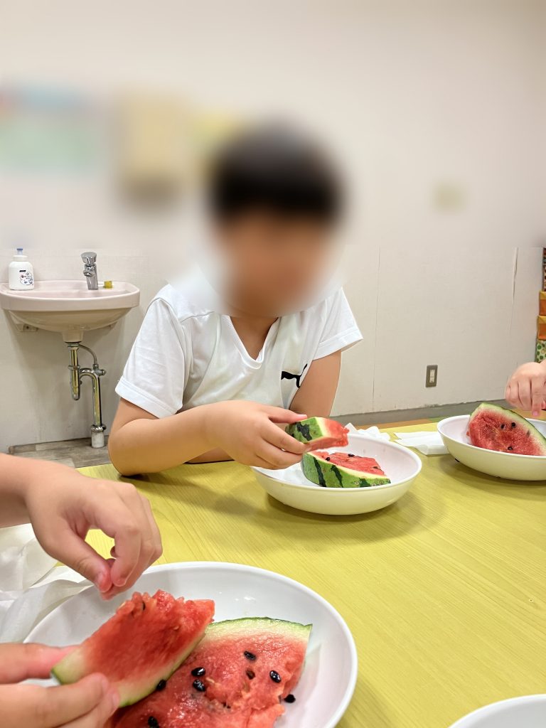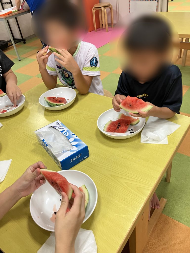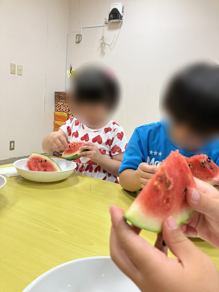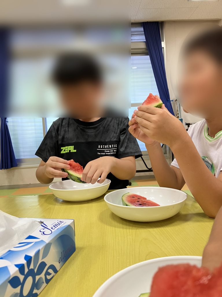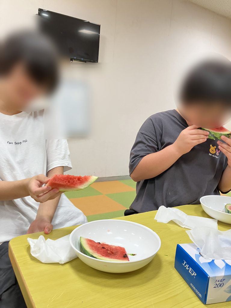 割れたスイカは食べやすい大きさに切ってもらい、みんなで食べました🍉