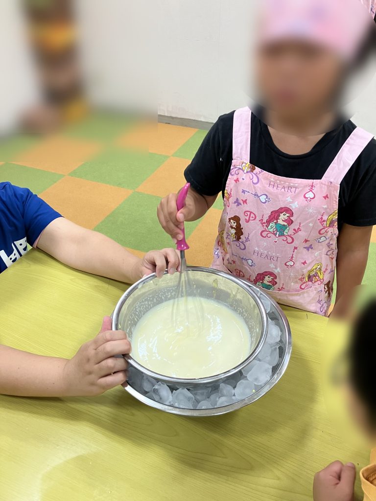 大きいボウルに氷を入れ、氷の上にアイスの材料が入ったボウルを乗せて、固まるまで混ぜました。