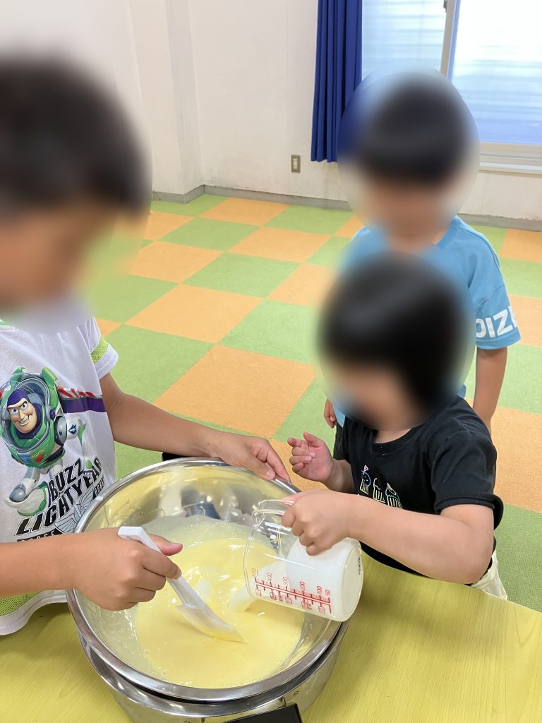 卵や生クリームなどの材料をボウルに入れて混ぜました。